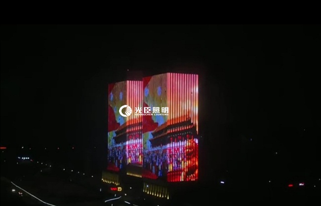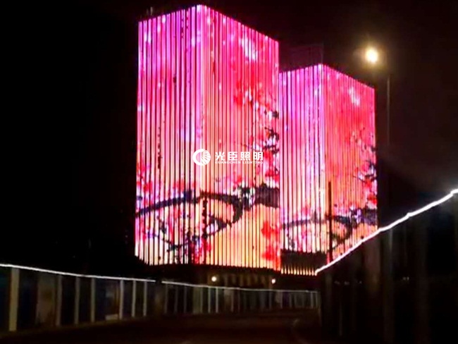 A、B雙子大樓夜景亮化主要以全彩線條燈做屏的形式,采用DMX512八段RGBW線條燈,合計(jì)一萬(wàn)多米,縱向安裝。