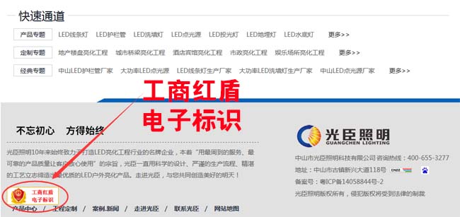大看可以通過(guò)這個(gè)標(biāo)識(shí)去了解該公司的資質(zhì),紅盾電子標(biāo)識(shí)一般會(huì)安裝在網(wǎng)站的底部位置,這也是您找線條燈廠家的一種標(biāo)準(zhǔn)之一哦,光臣照明從網(wǎng)站建站開(kāi)始已取得紅盾電子標(biāo)識(shí),您可以通過(guò)官方網(wǎng)站首頁(yè)底部查看。