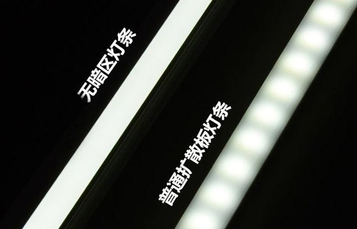 首先,大家來看一下上面這張圖,圖片中我們能了解到LED線條燈有暗區(qū)和無暗區(qū)的區(qū)別,出現(xiàn)暗區(qū)的線條燈光束呈現(xiàn)出點(diǎn)狀形態(tài),無暗區(qū)線條燈的光線十分柔和,原因在于:選用了光擴(kuò)散材料的PC面罩。